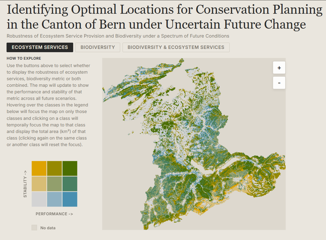 The underlying data come from simulations of ecosystem services and biodiversity in the Canton of Bern under 225 future scenarios, combining alternative assumptions about land use, economic development, demographic change and climate change. Rather than collapse that into a single static figure, I wanted a small interactive map that would let someone explore where outcomes are not just strong, but robust.